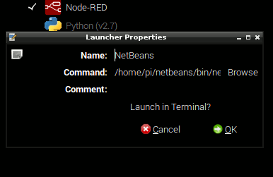 adjusted to reference your home directory rather than that of user pi if necessary. After this you can run NetBeans from the menu. If you want to add an icon then simply right click on the menu item, select properties and click on the default icon. Next simply navigate to /home/pi/netbeans/nb/ and select netbeans.icon.